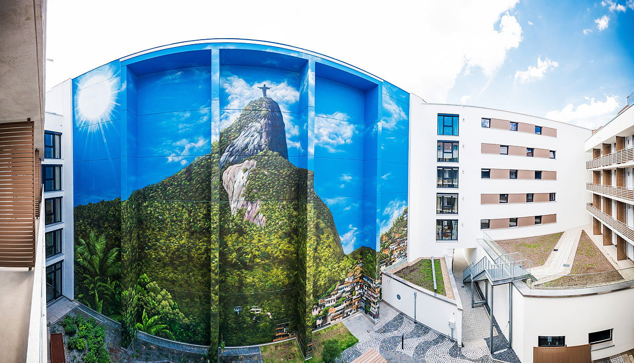 Eine persönliche Beziehung des Kunden zu Rio de Janeiro ließ schnell die Idee mit dem Zuckerhut aufkommen. Nun weht ein Hauch von Südamerika durch den Offenbacher Hafen und erfreut nicht nur die Appartement- Bewohner. Immer öfter pilgern Besucher in den Innenhof um das Kunstwerk zu bewundern.