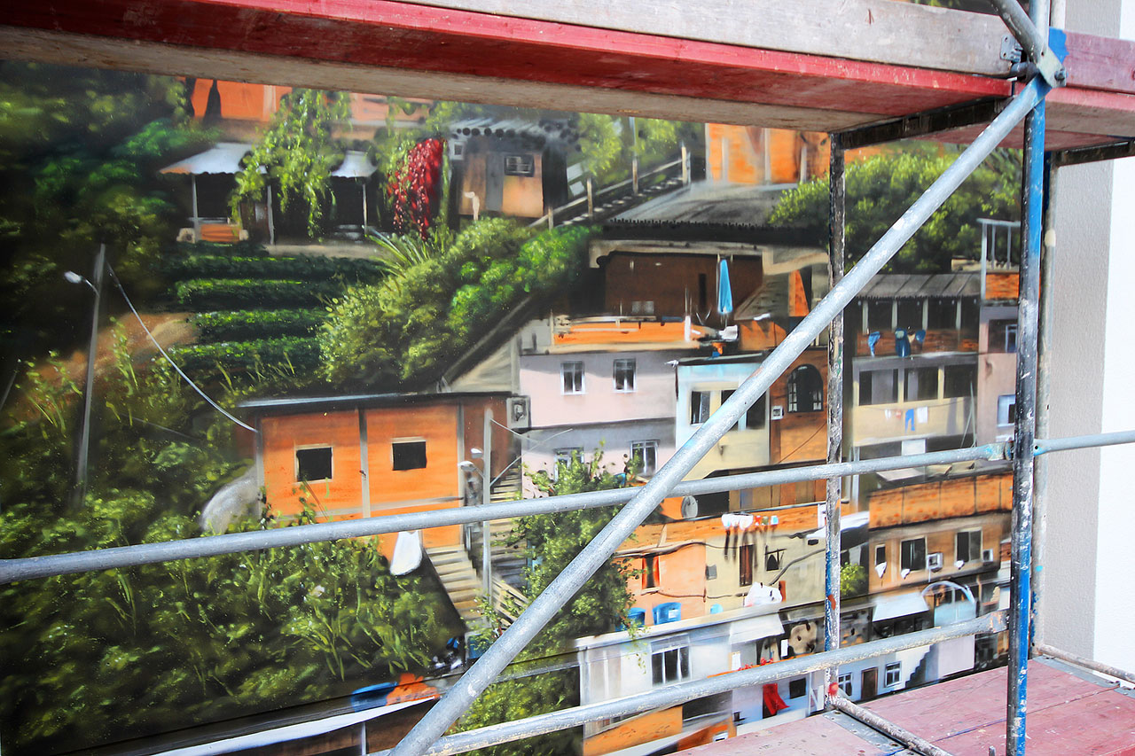 Die Verschönerung dieser 25 Meter hohen und 30 Meter breiten Parkhauswand war die Herausforderung für den Sommer 2017. Die massive Betonwand wollte sich so gar nicht in die neu errichtete Appartement- Anlage „Main- Atrium“ am Offenbacher Hafen einfügen. Die ersten Bilder des Auftragsgeber zur damaligen Situation ließen mein Herz höher schlagen denn diese Wand bot eine schöne Angriffsfläche für meine Mission „Grauer Alltag ade’“.